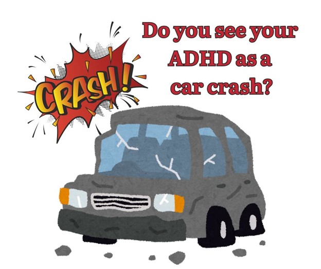 ADHD can be a crazy messed-up car crash – sometimes even a multi car pile up! You leave behind strewn across the highway of life, a bumper here and an old rusty exhaust pipe there. Your windscreen is smashed so you can´t see out & your number plate is hanging on by a thread. And you´re left with serious internal injuries that others can´t see.