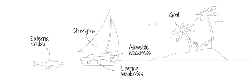 This approach does not suggest you ignore your weaknesses, but consider them carefully. Weaknesses above the waterline will not hinder your progress, whereas those below may have a limiting effect, slowing your progress and potentially preventing you from reaching your goal. So, we accept those above the waterline as allowable weaknesses—no one is strong at everything—but we address those below the waterline because they have a limiting impact.