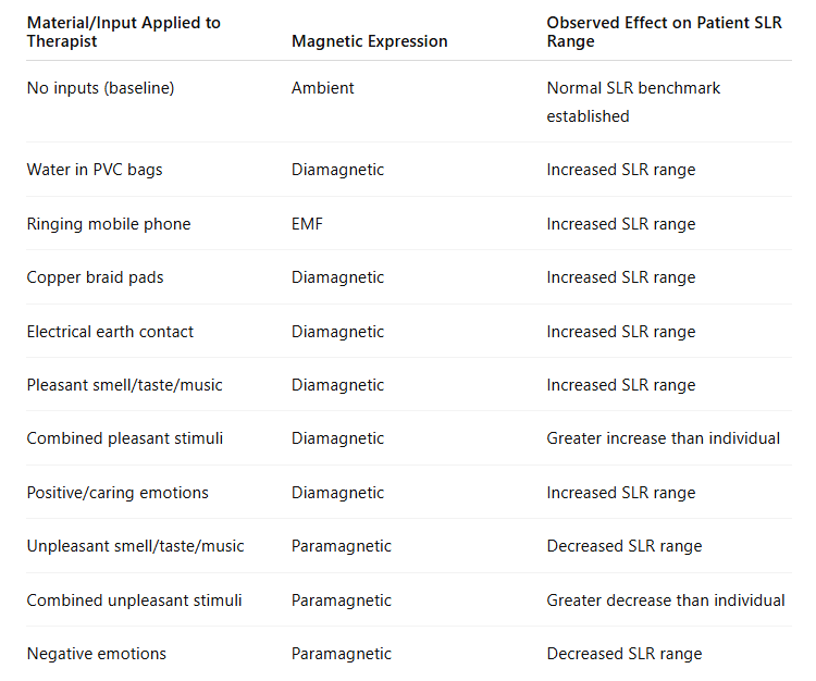 These findings suggest that the therapist's autonomic and emotional state modulates the patient's tissue response, likely via diamagnetic field interactions.