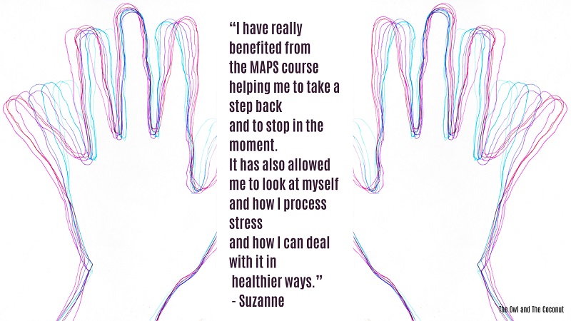 We recommend that anyone interested in learning more about MAPS comes along to our Introduction to MAPS 1 hour workshops, where you can meet us, Gemma and Pam – the directors of The Owl and The Coconut and the MAPS course leaders. Here you can try MAPS for yourself, ask any questions and learn more about our 8 week MAPS course. It’s offered live via Zoom, so it can be accessed from anywhere and we’ve just made it available On Demand so now you can get stuck right in anytime anyplace.