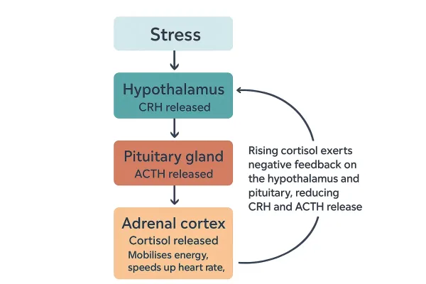 When you experience stress, the body responds immediately. The hypothalamus releases corticotropin-releasing hormone (CRH), which signals the pituitary gland to release adrenocorticotropic hormone, prompting cortisol production from the adrenal glands. Cortisol mobilises energy, speeds up the heart rate, and dilates blood vessels to prepare for action. Once cortisol levels rise sufficiently, the hypothalamus senses the feedback and stops producing CRH. The system returns to baseline, the stress response fades.