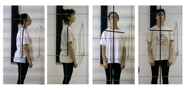 Patient with scoliosis. The instructions before photos are taken are 'breath in and out and let your body relax and slump'. Front view: shoulders more aligned and back. Side view: head more in line with shoulders and hips.